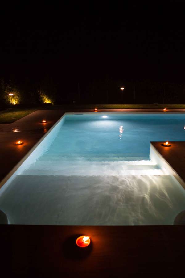 Quando arriva la sera possiamo creare un’atmosfera davvero magica e suggestiva con le nostre candele scenografiche opportunamente posizionate a bordo piscina.